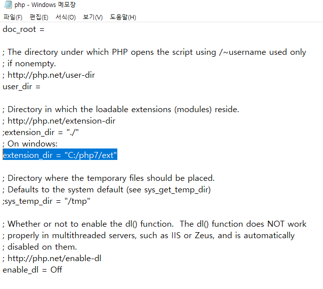 2. php7 폴더에서 php.ini-development 의 extension_dir의 경로를 C:/php7/ext로 변경하여 php.ini로 저장합니다.
