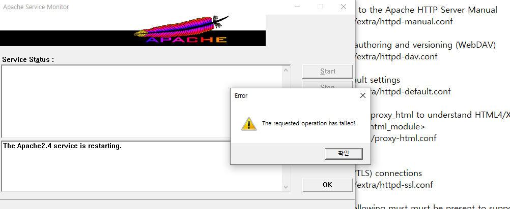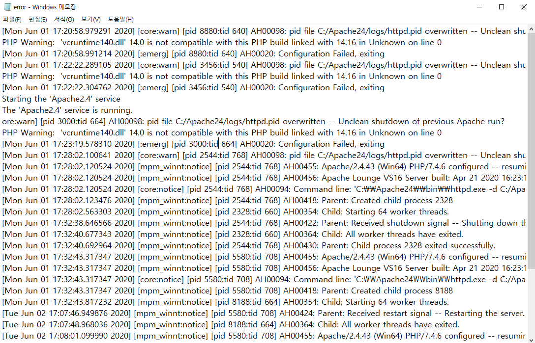 이럴 때는 겁먹지 않고 C:/Apache24/logs/error.log 파일을 열어봅니다.