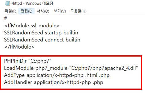 3. Apache24의 httpd.conf 파일에서 몇 가지를 수정합니다.