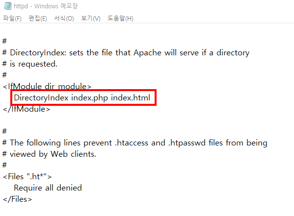 먼저 C:/Apache24/conf/httpd.conf 파일의 DirectoryIndex 부분에 index.php를 추가해줍니다.