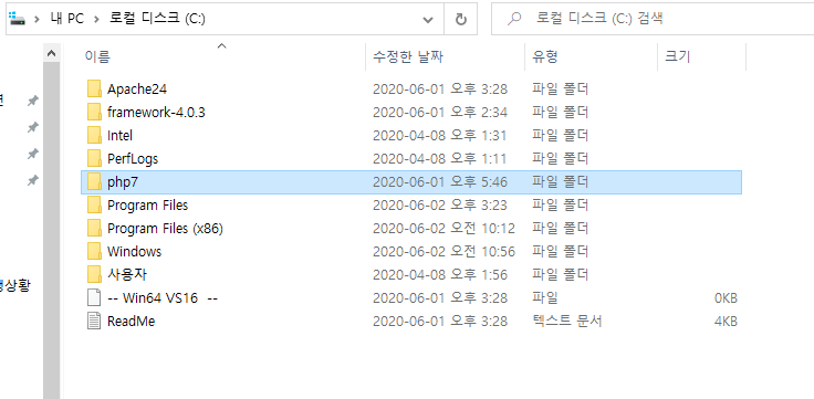 이후 C:/ 의 경로에 php7이라는 폴더를 생성하여 이곳에 압축 해제하였습니다.