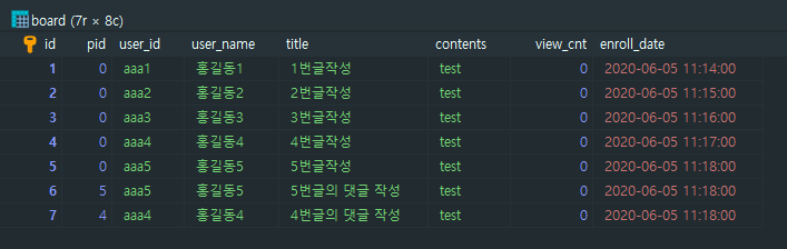 pid : 원글 번호로 기본은 0번이고, 댓글을 만들 시 해당하는 원글의 id가 pid로 설정됩니다.