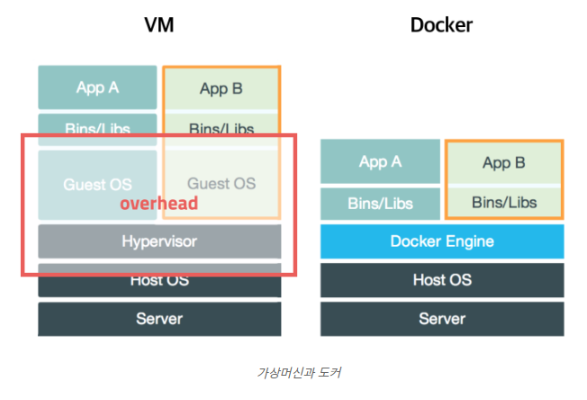 리눅스 컨테이너 : 단순히 프로세스를 격리 => 가볍고 빠르게 동작 / 필요한 만큼의 CPU, Memory 사용 / 성능적으로 손실이 거의 없음